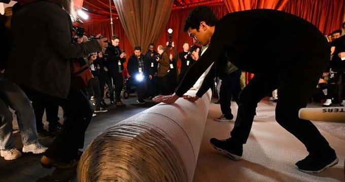 Mientras tres personas de la producción desplegaban los dos enormes rollos de alfombra, Kimmel aprovechó para hacer sus primeros chistes.