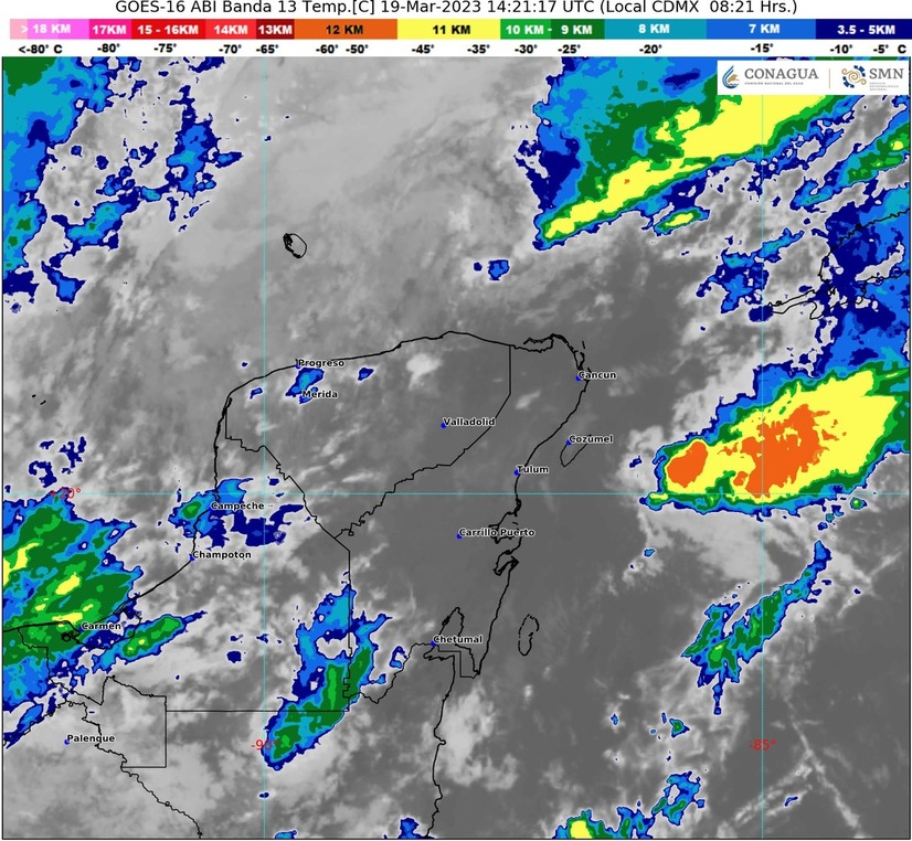 Se espera para la Península de Yucataán cielo nublado durante el día, con lluvias puntuales intensas en Campeche, así como puntuales muy fuertes en Yucatán y Quintana Roo; todas con probables descargas eléctricas.