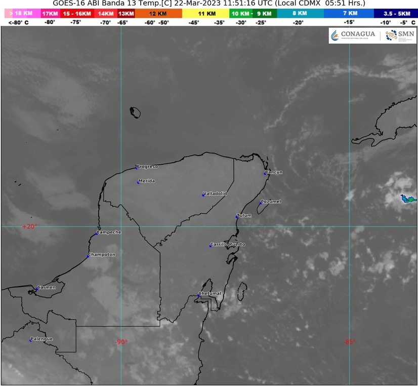 En la Península de Yucatán, el cielo estará medio nublado con lluvias y chubascos en Quintana Roo, así como lluvias aisladas en Campeche y Yucatán. El ambiente será templado por la mañana y caluroso por la tarde, con viento de componente este con rachas de 40 a 50 Kilómetros por hora en costas de la Península.