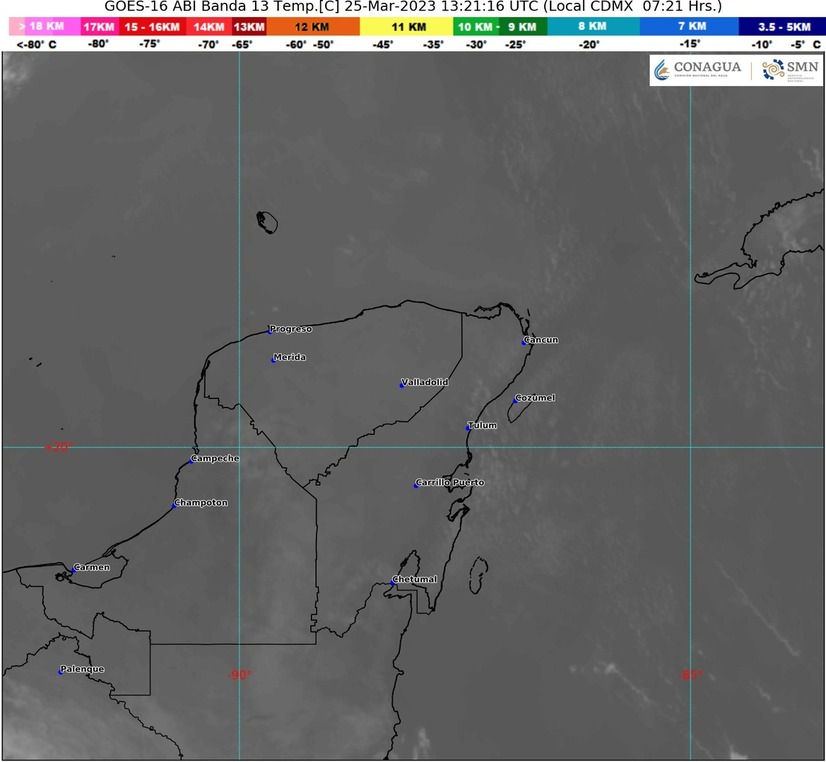 Para la Península de Yucatán se prevé cielo medio nublado con lluvias aisladas en Campeche y Quintana Roo; sin lluvia en Yucatán.