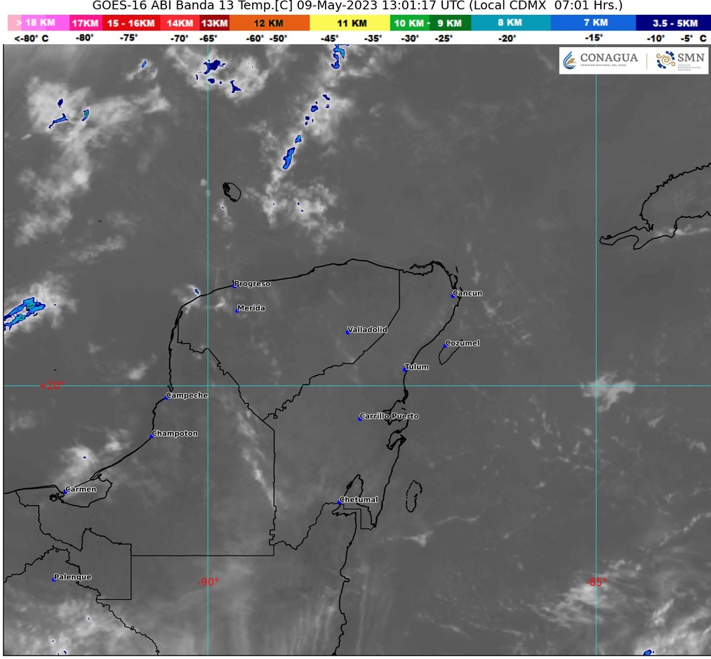 Para la Península de Yucatán se prevé cielo medio nublado la mayor parte del día con lluvias aisladas en Quintana Roo, sin lluvia en Campeche y Yucatán.