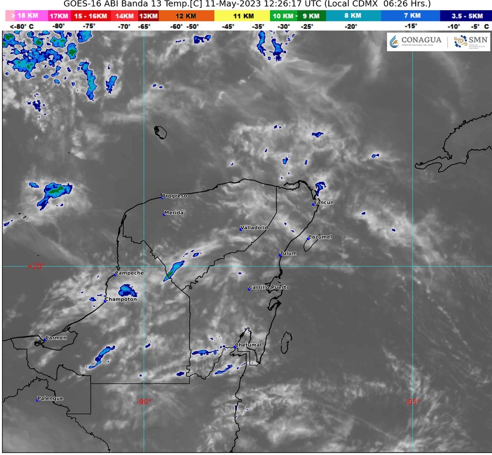 Para la Península de Yucatán esperan cielo medio nublado a nublado con intervalos de chubascos en Quintana Roo y lluvias aisladas en Campeche y Yucatán.