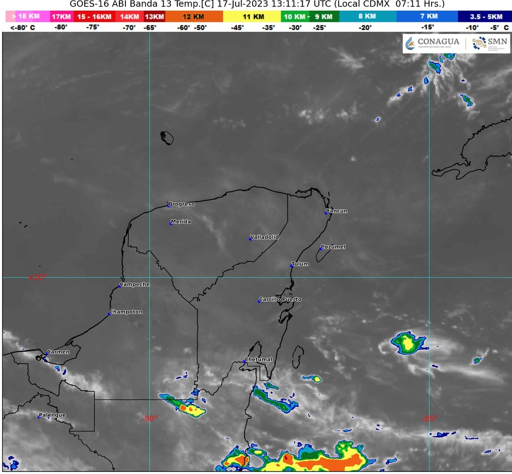 Para la Península de Yucatán se espera cielo parcialmente nublado durante la mañana y nublado por la tarde con lluvias puntuales fuertes en Campeche, y lluvias con chubascos acompañadas de descargas eléctricas en Yucatán y Quintana Roo.