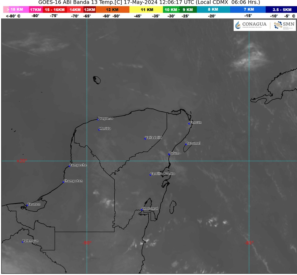 Península de Yucatán: Cielo medio nublado durante el día con lluvias aisladas en Campeche y Quintana Roo. Sin lluvia en Yucatán. Ambiente cálido por la mañana y muy caluroso a extremadamente caluroso durante la tarde. Viento de componente sur de 20 a 30 km/h con rachas de 50 a 70 km/h.
