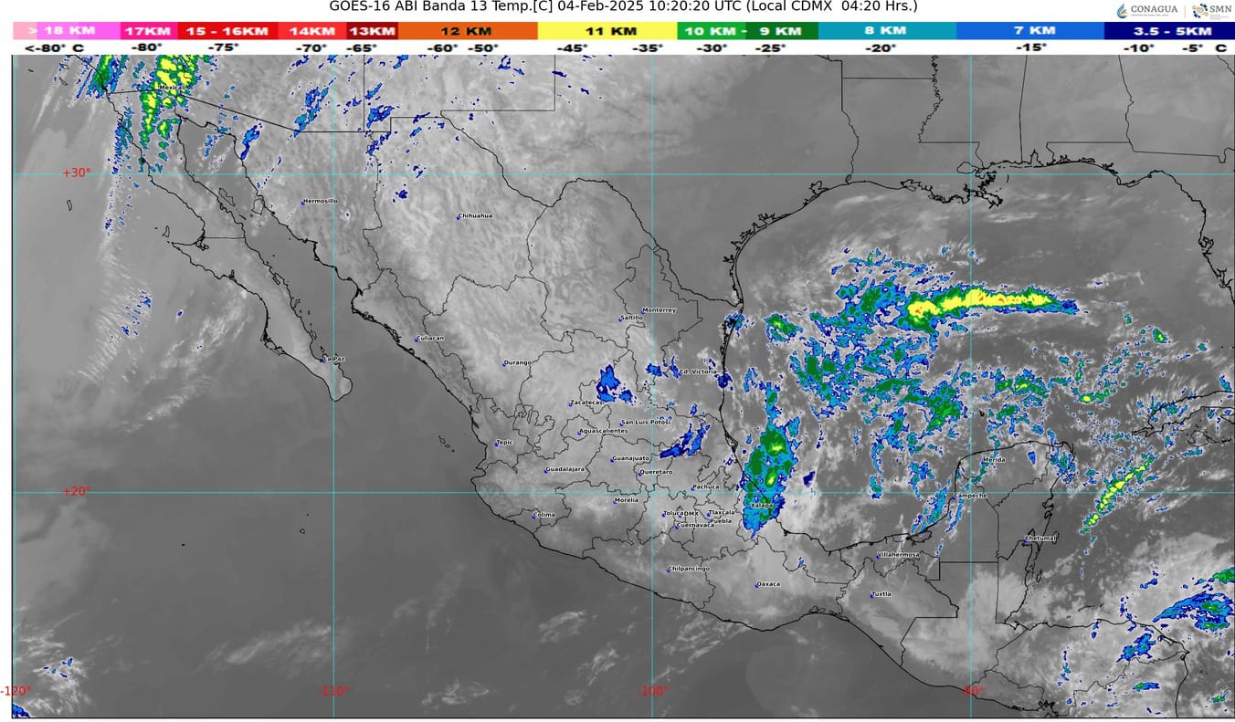 Finalmente, una circulación anticiclónica en niveles medios de la atmósfera predominará sobre el noroeste, norte y occidente de la República Mexicana, generando ambiente vespertino cálido en la mayor parte del territorio nacional, con temperaturas máximas calurosas de 35 a 40 grados centígrados en zonas de Sonora, Sinaloa, Nayarit, Jalisco, Colima, Michoacán, Chihuahua, Durango, Nuevo León, Tamaulipas, Morelos, Guerrero, Oaxaca y Chiapas
