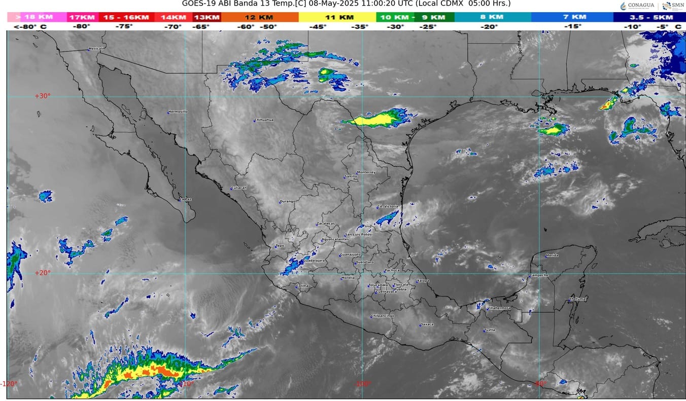 Una circulación anticiclónica en niveles medios de la atmósfera mantendrá el ambiente caluroso a muy caluroso sobre la República Mexicana, prevaleciendo la onda de calor en zonas de Jalisco (centro, suroeste y sur), Colima (este y noreste), Michoacán (mayor parte), Guerrero (mayor parte), Oaxaca (oeste, suroeste, sur y este), Chiapas (noroeste y oeste), Guanajuato (sur), Querétaro (centro y sureste), Hidalgo (suroeste), Puebla (sur y suroeste), Tlaxcala, Estado de México (suroeste), Ciudad de México, Morelos, Veracruz (sur), Tabasco (suroeste), Campeche (centro) y Yucatán (suroeste). A partir de este día finalizará la onda de calor en Nuevo León, Tamaulipas y San Luis Potosí.