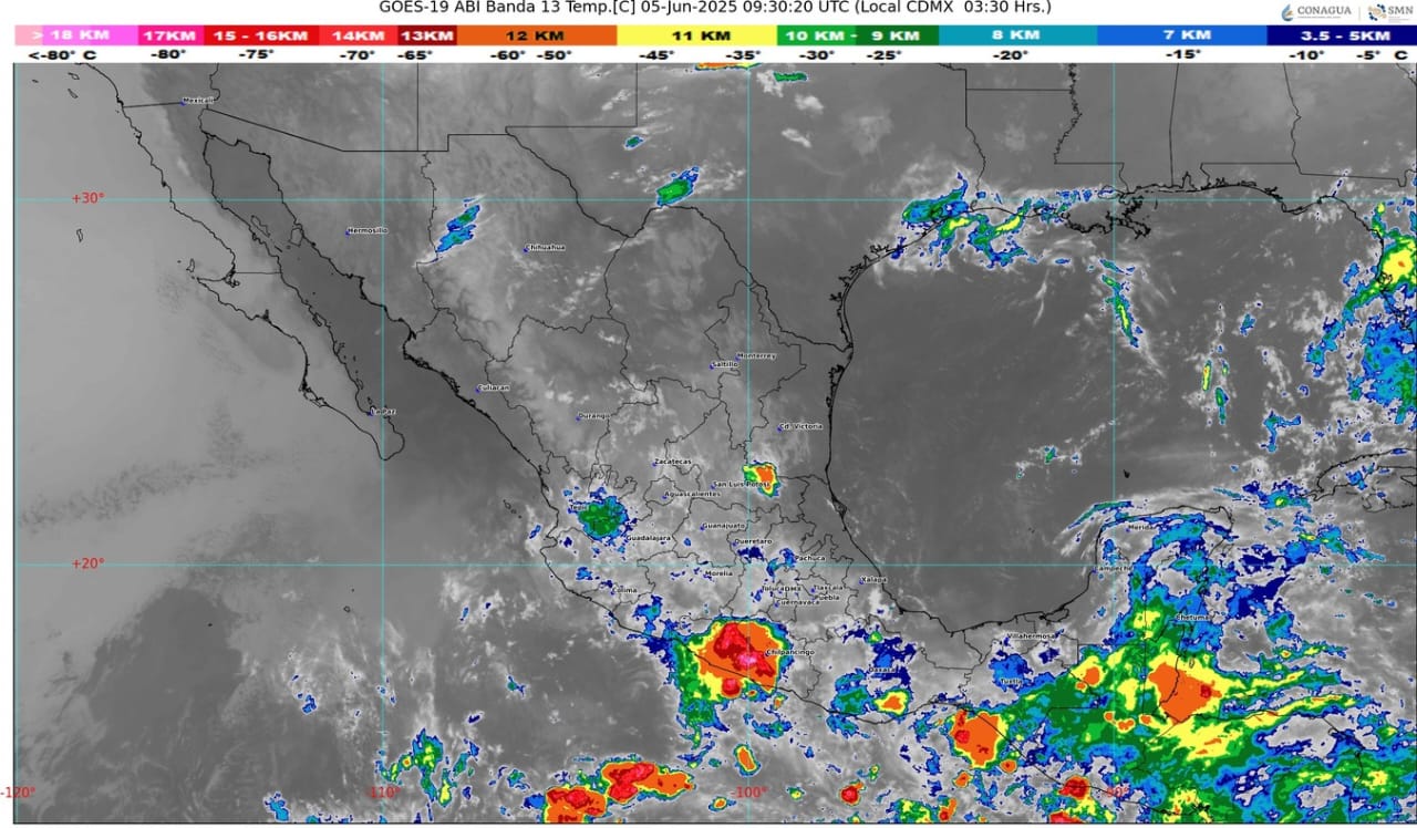 Una circulación anticiclónica en niveles medios de la atmosfera, mantendrá el ambiente caluroso a muy caluroso sobre gran parte de la República Mexicana, prevaleciendo la onda de calor en los estados de Chihuahua, Coahuila (oeste y suroeste), Nuevo León (sur), Tamaulipas (suroeste), San Luis Potosí (norte), Zacatecas, Durango, Aguascalientes (sur), Sinaloa, Nayarit, Jalisco, Colima, Michoacán, Guerrero (noroeste y oeste) y Oaxaca (centro, sur y este); extendiéndose hacia Sonora (sur) y Campeche (norte y oeste).