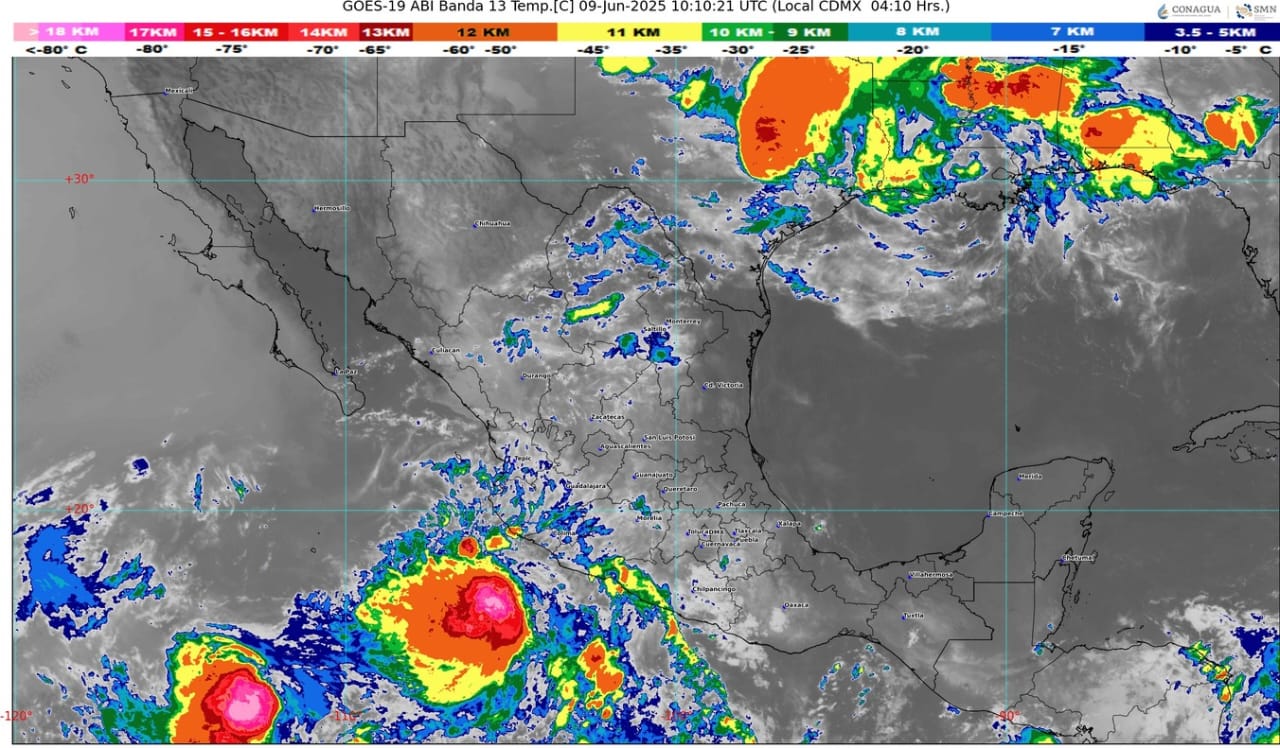 Asimismo, una circulación anticiclónica en niveles medios de la atmósfera mantendrá el ambiente caluroso a muy caluroso sobre gran parte de la República Mexicana, prevaleciendo la onda de calor en Chihuahua, Coahuila, Durango, Sinaloa, Nayarit, Jalisco, Michoacán, Guerrero, Oaxaca, Veracruz (centro) y Campeche. Finalmente, el ciclón tropical Cosme se mantendrá lejo