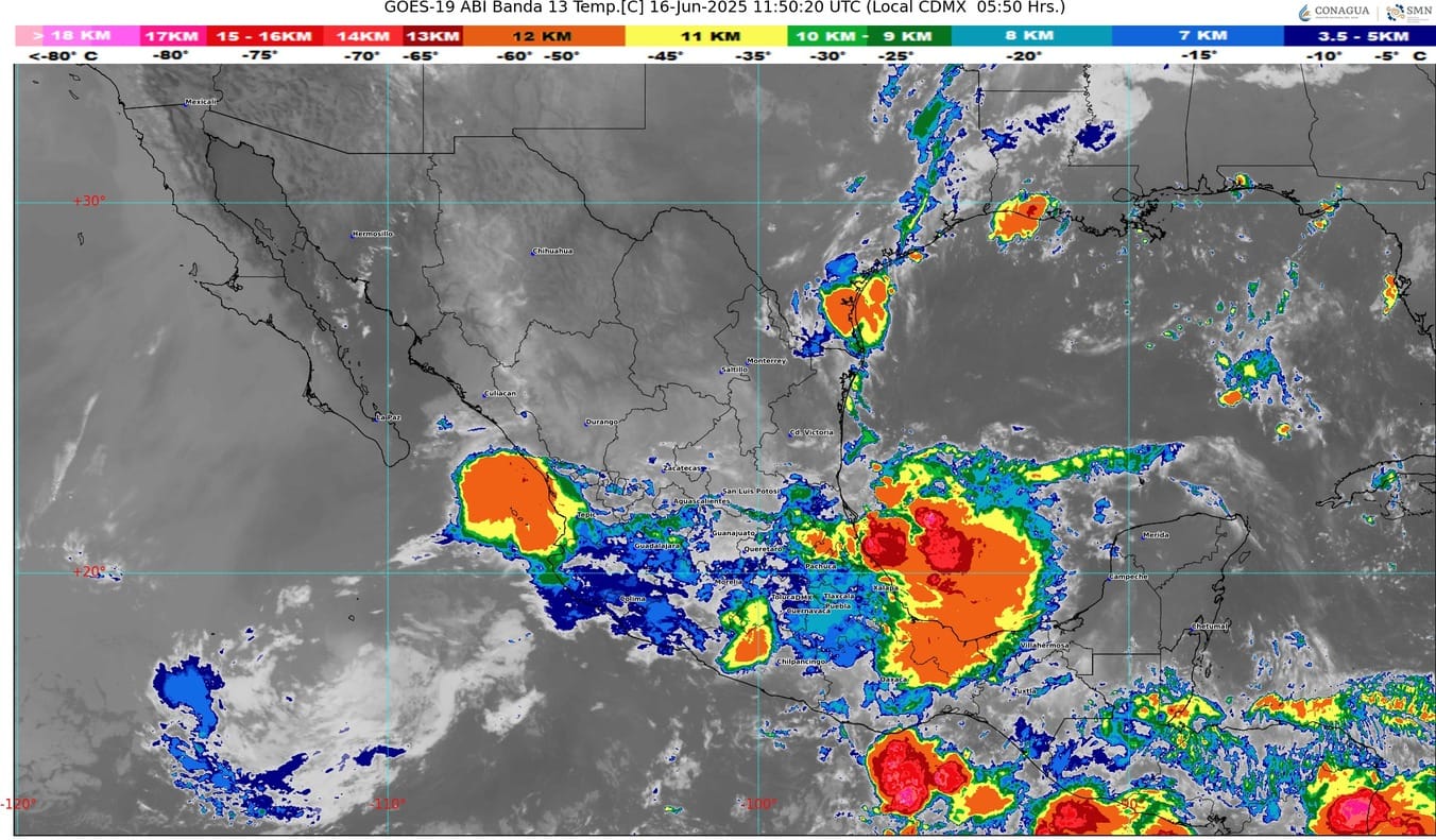 A su vez, un canal de baja presión sobre el norte y centro del territorio nacional, en interacción con inestabilidad atmosférica y con la entrada de aire húmedo del golfo de México, generarán lluvias puntuales intensas en el sur de Veracruz; puntuales muy fuertes en Puebla, Estado de México, Guanajuato y Zacatecas.