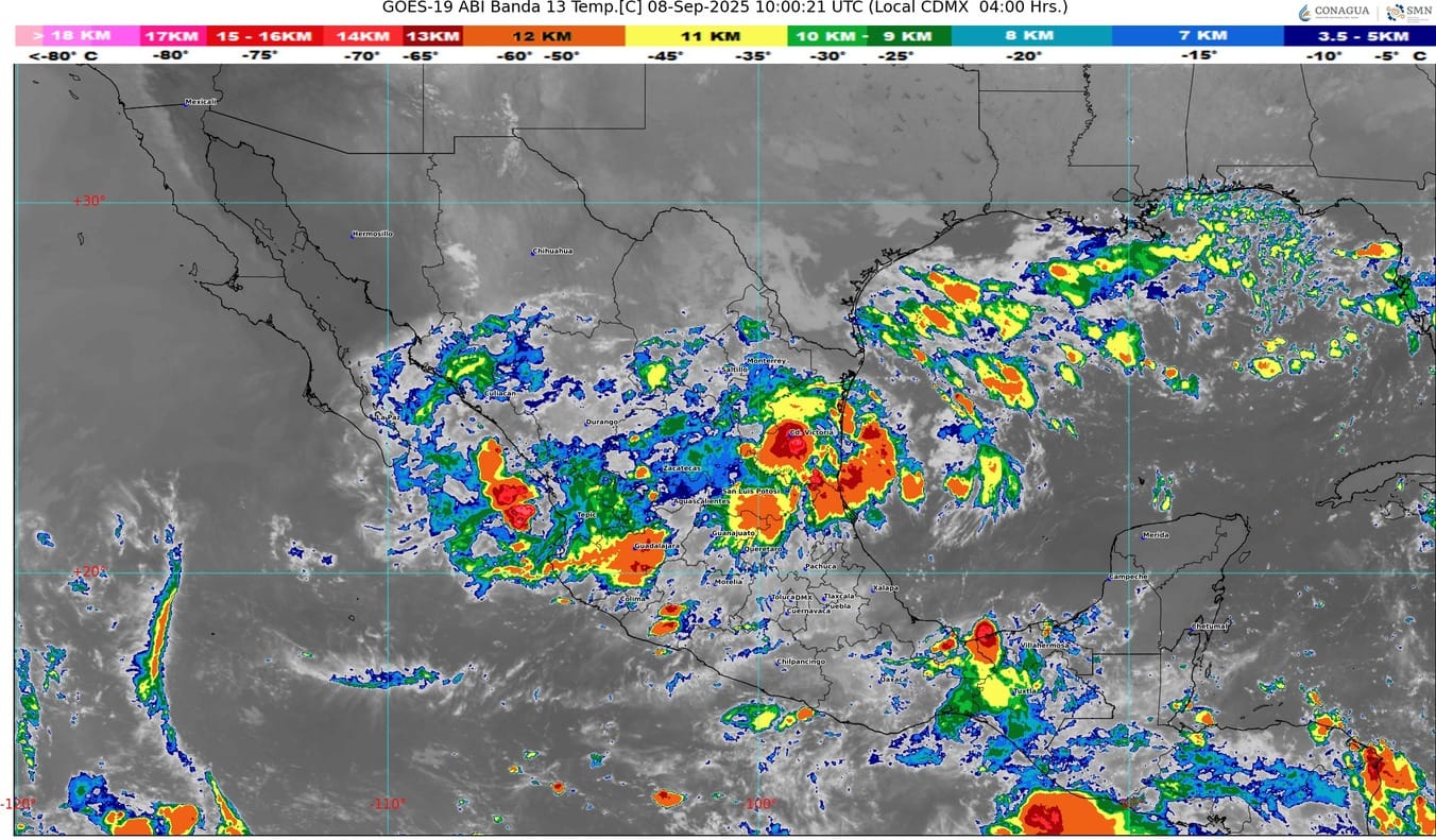 A su vez, el sistema frontal número 2, con características de estacionario sobre el noreste de México, interaccionará con inestabilidad atmosférica, lo que generará lluvias puntuales intensas en Tamaulipas; puntuales fuertes con rachas de viento de 40 a 60 Kilómetros por hora (km/h) en Nuevo León y Coahuila.