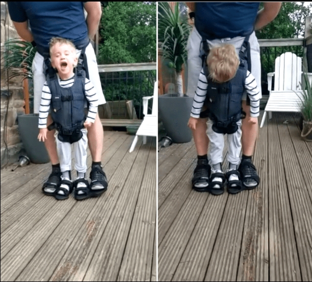 Gracias a la ayuda de sus padres, el niño con parálisis cerebral pudo decir “mamá” y ahora, con la utilización de un arnés acoplado a las piernas de su padre, logró dar sus primeros pasos. La conmovedora escena fue registrada por la familia al ver a su pequeño dar los primeros pasos.
